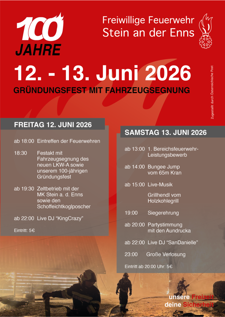 Am 12. und 13. Juni 2026 feiert die Freiwillige Feuerwehr Stein an der Enns ein Jubiläum, das nur einmal stattfindet: 100 Jahre Feuerwehrgeschichte, begleitet von einer feierlichen Fahrzeugsegnung und einem zweitägigen Festprogramm voller Highlights.